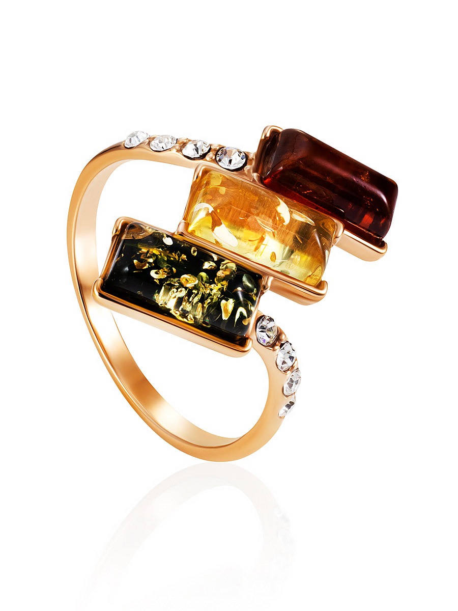 A vibrant gold-plated ring with multi-colored amber and “Mosaic” crystals