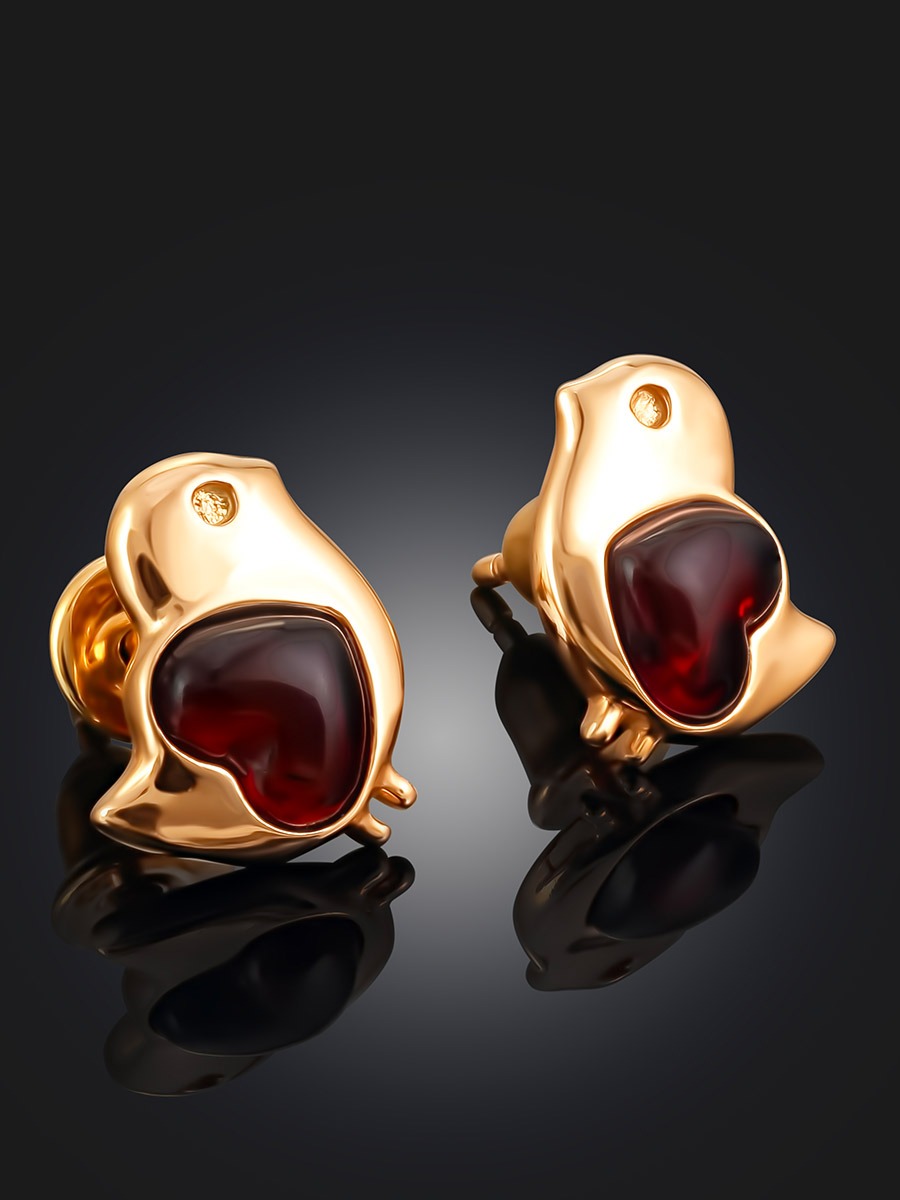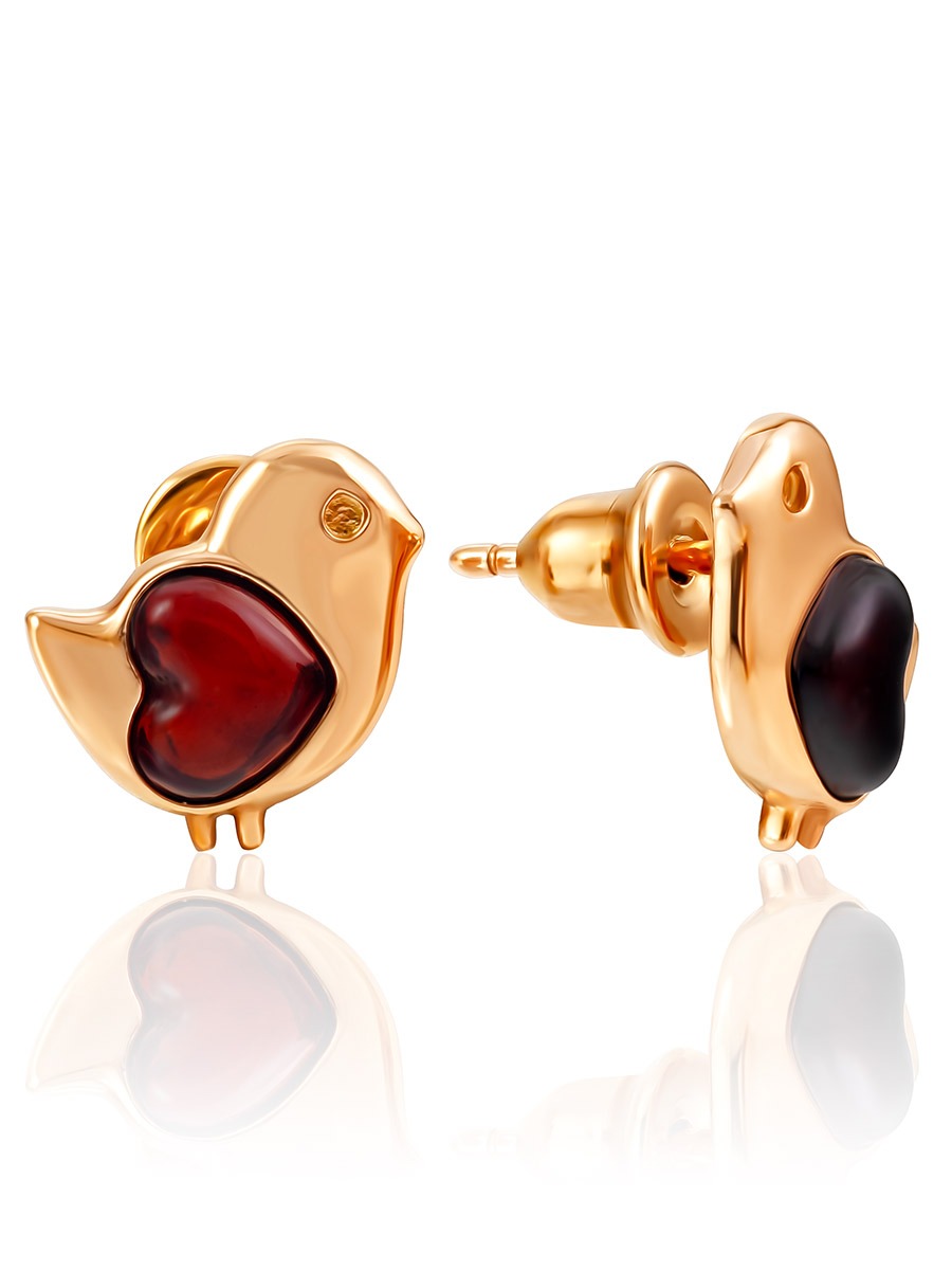 Charming Gold-Plated Stud Earrings “Bird” with Cherry Amber